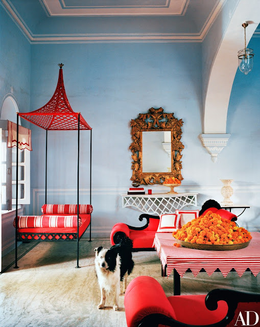 Remember Narain Niwas Palace Hotel’s Bar Palladio? If you don’t, I recommend you take a moment to jog your memory. Stunning, right? Now, thanks to Architectural Digest, we get a peek inside the mastermind’s magical residence, which also happens to be inside the Narain Niwas. When the former Tocca designer Marie-Anne Oudejans moved to into the ground floor apartment of the Jaipur hotel seven years ago, she had no idea that one day, she’d fall in love with interior design and decorating. After being approached to reimagine the hotel bar and restaurant, Marie-Ann thought it was time to give her own suite a makeover. Walls were repainted, chairs were reupholstered and furniture was custom built. It’s floor to ceiling breathtaking. The canopies! The painted ceilings! The colors! Glorious!!